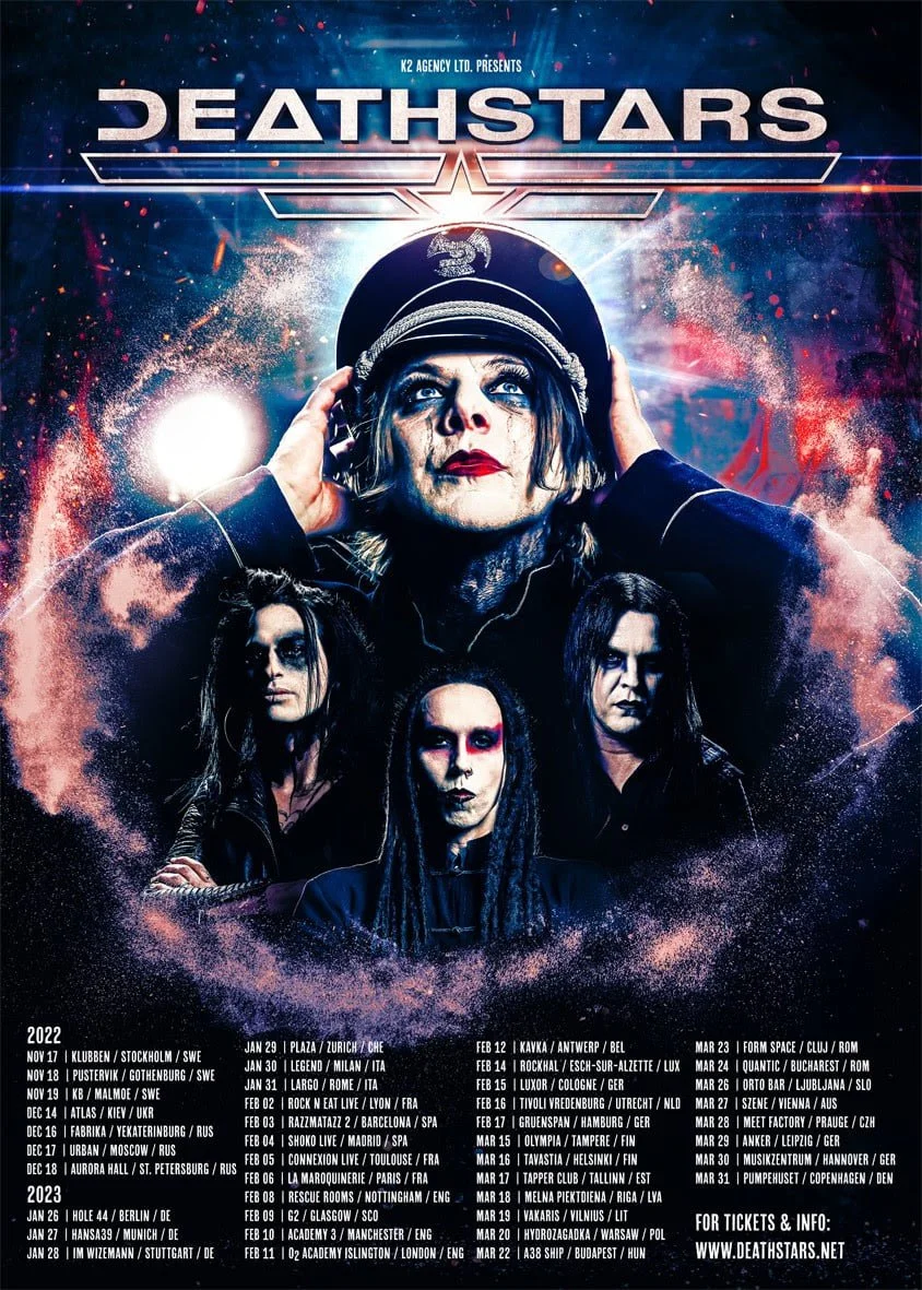 With the uncertainties of possible lockdowns and rising infection numbers, planning a Pan-European Tour as glam metal sensation DEATHSTARS have done is getting nearly impossible and a massive risk for bands around the globe. For this reason, the Swedes see themselves forced to once more postpone their upcoming shows - yet the time will come for you to finally witness the combo live on stage with the songs from their new, still untitled album that has been quietly in the making within the past years. "It’s been a frustrating couple of years, yet because of too much uncertainty regarding the pandemic we need to postpone the European tours again. We of course regret to inform you this but it’s not in the hands of the band. We like to thank the fans for patience and hope to see you all during the upcoming shows", states Whiplasher Bernadotte. These are the new tour dates: