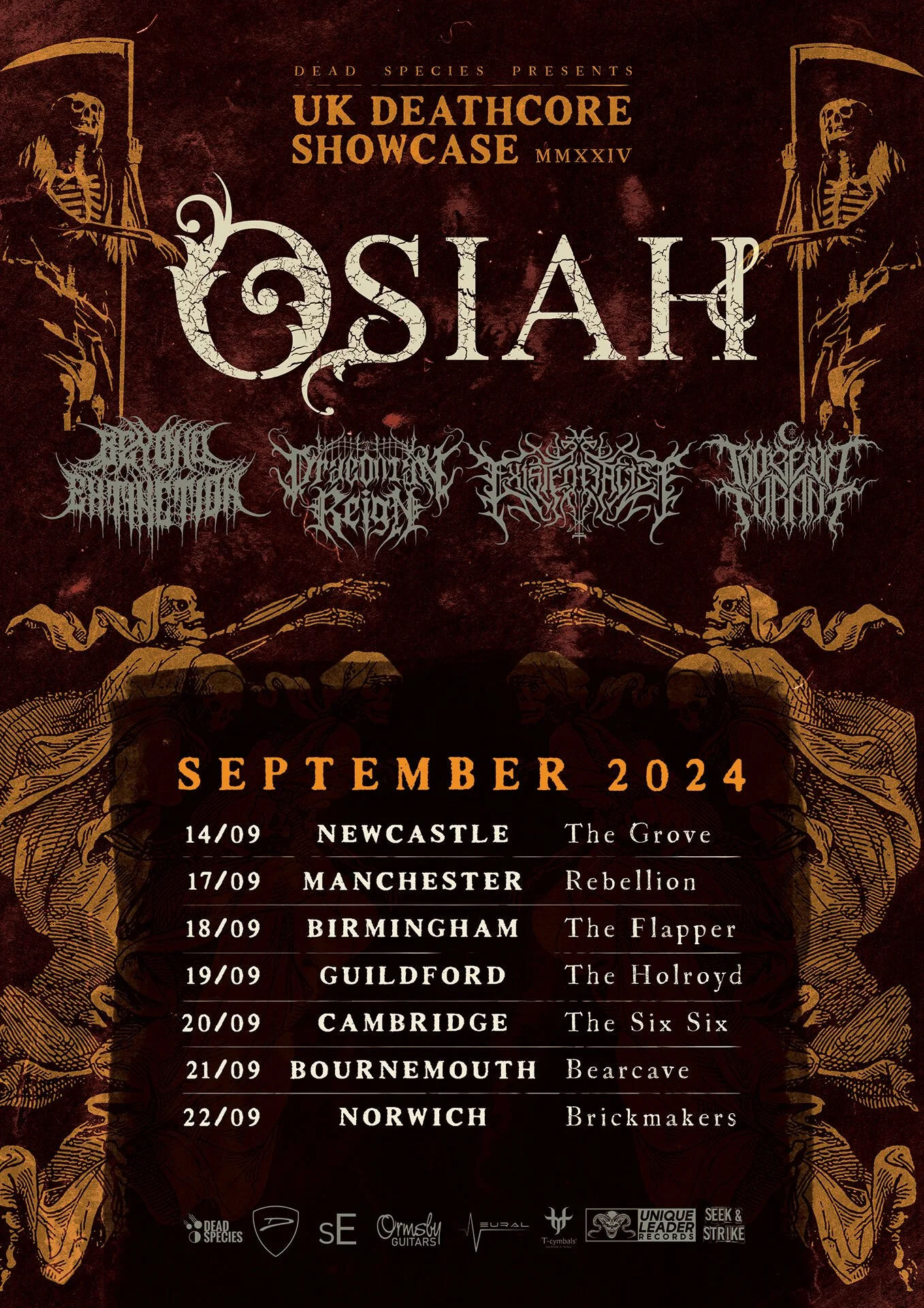 Sponsored by the thirst murdering Liquid Death, Unique Leader Records Deathcore skull crushers Osiah have announced a September headlining tour with a rotating bill of support bands. Beyond Extinction, Draconian Reign, Existentialist and To Obey A Tyrant are those bands in question with the run shaping up as follows: